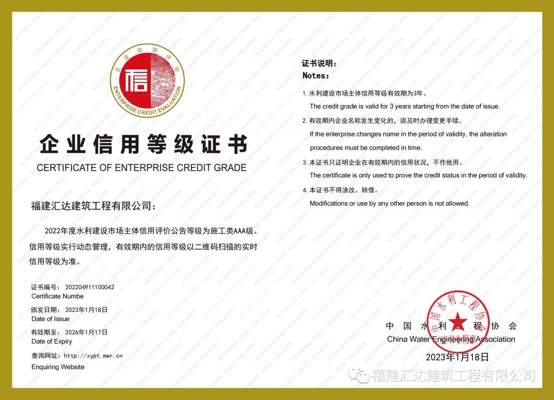 乐鱼online(中国)在2022年度水利建设市场主体信用评价公告等级为施工类AAA级